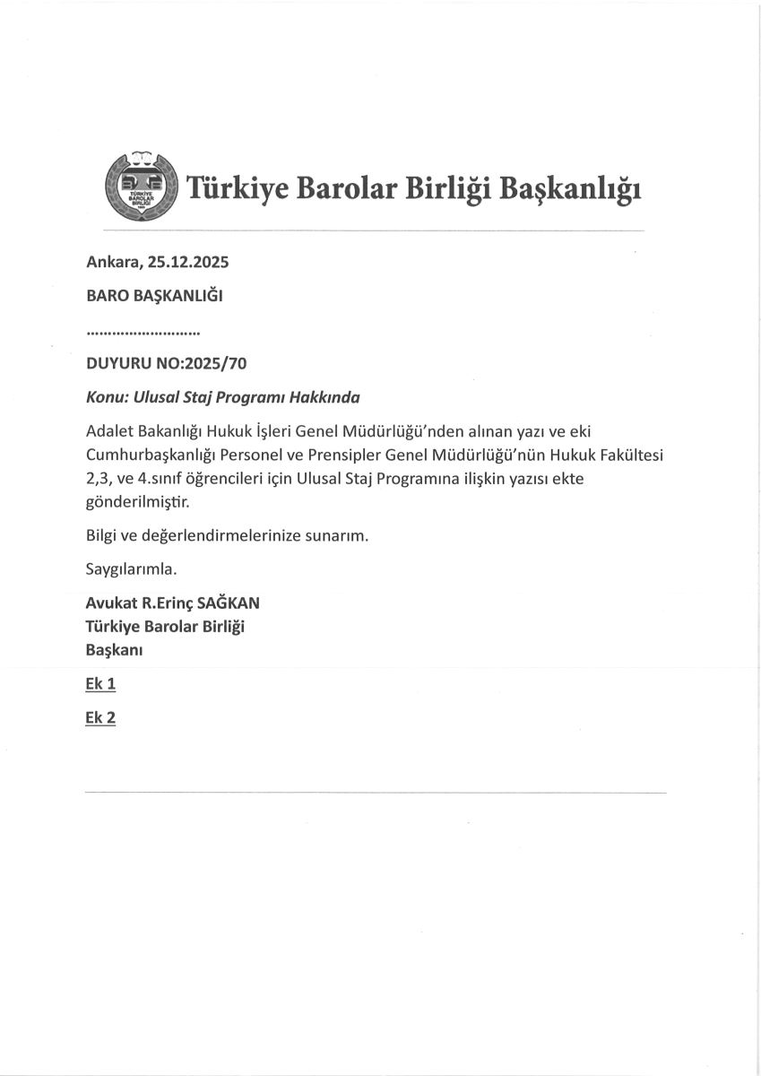 ULUSAL STAJ PROGRAMI HAKKINDA DUYURU NO:2025/70