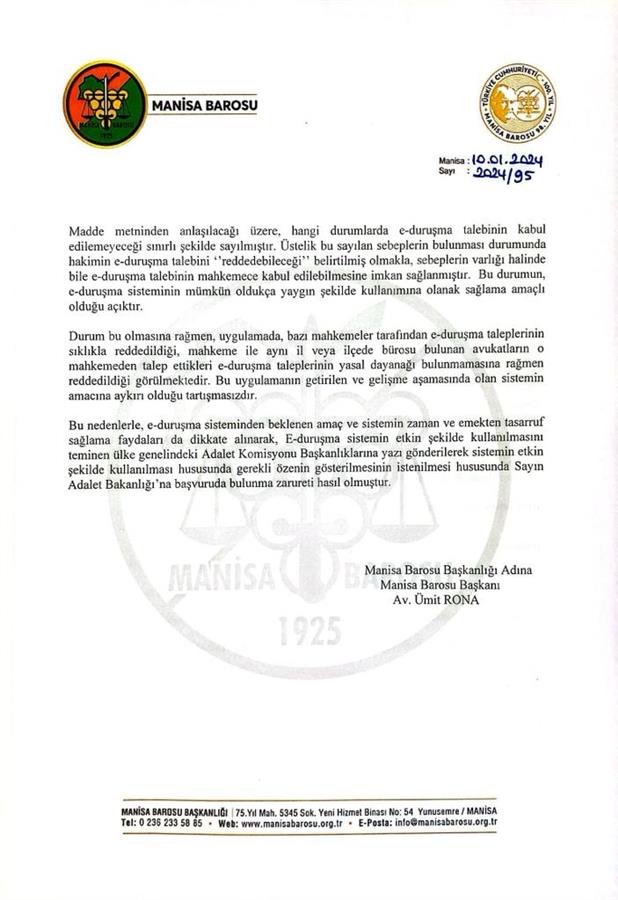 E-DURUŞMADA YAŞANAN PROBLEMLER İLE İLGİLİ ADALET BAKANLIĞINA BAŞVURUMUZ