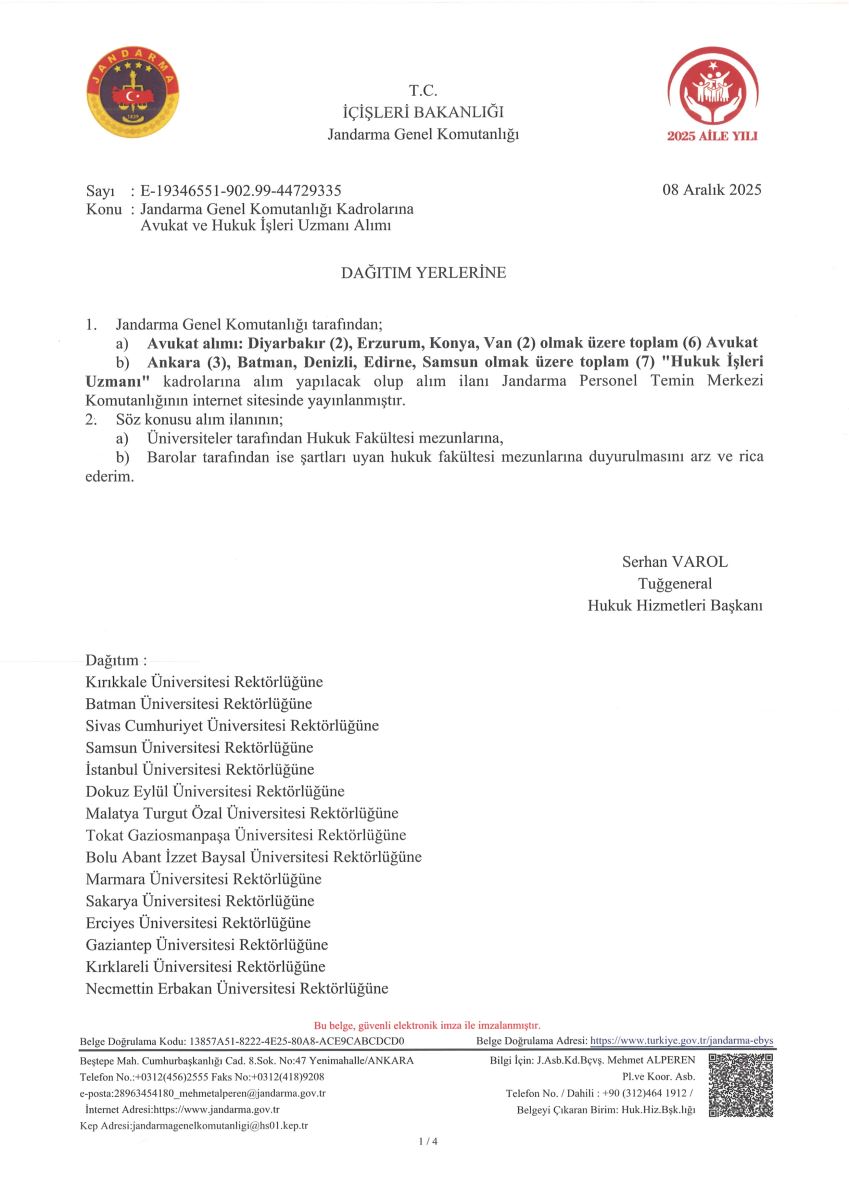 JANDARMA GENEL KOMUTANLIĞI KADROLARINA AVUKAT VE HUKUK İŞLERİ UZMANI ALIMI HK.